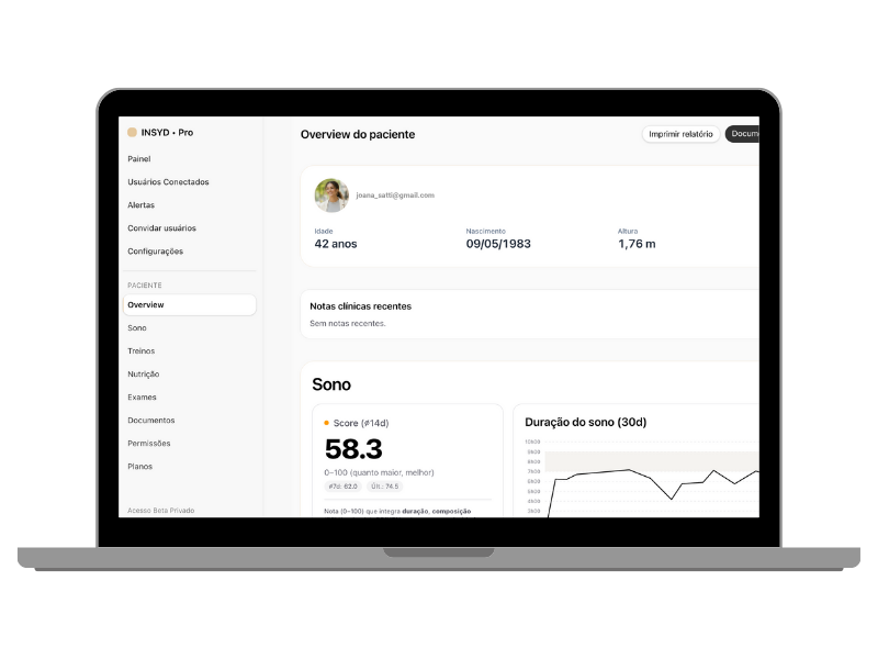 - ✓Profissional vê sono, treinos, corpo, recuperação e nutrição